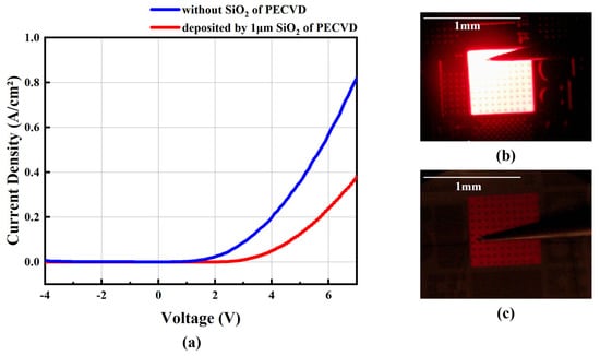 To identify the root cause, fabrication Step 4, described in Figure 1c, was systematically investigated. For testing consistency, large-area 1 mm × 1 mm square p-electrode patterns were lithographically defined to facilitate probing and microscopic characterization, following the process of ICP etching to form mesa structure. Post-processing, wafers were diced to isolate test-piece structures. Subsequently, four distinct PECVD deposition protocols were tested to study the potential impact of the PECVD SiO2 deposition process. In the process, silicon from decomposed SiH4 reacted with oxygen species to form SiO2. By varying the N2O/N2 flow ratio (two groups at 1:1 and two at 2:1) and reaction temperature (two groups at 350 °C and two at 200 °C) while maintaining constant RF power, the deposition rate was set as 50.28 nm/min (20-min deposition). After etching 1 μm of SiO2 in buffered oxide etch (BOE), I-V characterization via probe station revealed preserved ITO conductivity (confirmed by probing lithographically patterned regions), while p-GaN activation tests using 1.5-mm-diameter indium balls as p-contacts exhibited abnormally higher forward voltages and lower current densities, as is shown in Figure 2a. The comparison of the forward opening voltage of mesa on the p-GaN layer was measured by the probe station. The blue lines and red lines, respectively, represent the situation before and after the deposition of the SiO2 dielectric layer by PECVD. After PECVD deposition, the original forward opening voltage is between 1 and 2 V; the luminescence condition under the microscope is shown in Figure 2b. However, after SiO2 deposition, this index is increased to about 3 V. Under the microscope, it directly appears as a dim luminescence, as is shown in Figure 2c. These results indicated hydrogen-induced reactivation of p-GaN during SiO2 deposition, leading to p-layer deactivation and device failure.