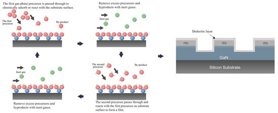 To mitigate hydrogen permeation, dense metal-oxide dielectric passivation layers (30-nm-thick Al2O3 or HfO2) were deposited by ALD on patterned ITO prior to subsequent SiO2 deposition and annealing, as is shown in Figure 3. The morphology of the dielectric layer closely fits the etched surface morphology and is uniformly and densely deposited on the surface and sidewall of the mesa structure, which plays a good role in protecting the p-GaN surface and sidewall protection. The illustrated process shown in Figure 3 outlines the key steps in an ALD deposition process of a dielectric layer. The procedure begins with the introduction of the first gas-phase precursor, which undergoes chemisorption or surface reaction with the substrate. Excess precursor and byproducts are purged using an inert gas. Subsequently, the second precursor is introduced, reacting with the adsorbed first precursor to form a thin film. A final inert gas purge ensures the removal of unreacted precursors and reaction byproducts, completing one deposition cycle. This sequential, self-limiting mechanism enables precise, layer-by-layer growth of the dielectric film. Meanwhile, the rapid formation of byproducts and the cleaning up of inert gases can avoid H and H plasma generated during deposition. Control groups with varying SiO2 thicknesses and thermal treatments were included to evaluate hydrogen-blocking efficacy and thermal stability under back-end processing conditions.