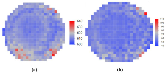 Room-temperature PL characterization was performed on the epitaxial wafers using a 375 nm excitation wavelength. Figure 4 presents the PL mapping of the full wafer surface, illustrating the spatial distributions of the peak wavelength (Wp) and full width at half maximum (FWHM), which provide critical insights into material uniformity. As shown, the Wp values are concentrated within 608–614 nm, while the FWHM ranges between 52 and 56 nm, which is respectable for InGaN-based Red LEDs. The observed uniformity in Wp and narrow FWHM distribution indicate excellent material homogeneity for silicon-based GaN, satisfying the requirements for subsequent device processing.