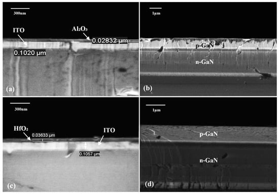 As described in Section 2.2, the wafers were cleaved after ITO patterning to isolate test structures for controlled experiments. Following Al2O3/HfO2 dielectric layer deposition, two samples from the control groups were retained for cross-sectional SEM analysis. As shown in Figure 5, the 100-nm-thick ITO layer and 30-nm-thick metal-oxide dielectric layers exhibit uniform thickness, distinct interfaces, and low defects. Lower-magnification SEM images further confirm the structural integrity of the multilayered wafer, which aligns with the epitaxial design illustrated in Figure 1a.