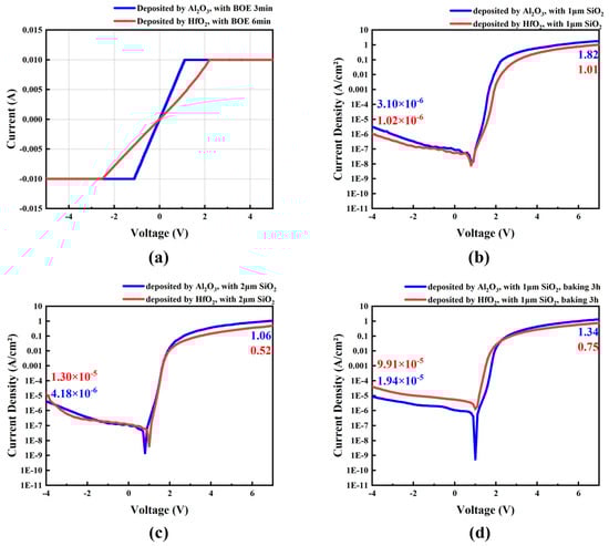 I-V characteristic for different treatment groups treated with Al2O3/HfO2. (a) I-V characteristic of ITO after BOE; (b) I-V characteristic of groups with PECVD 1 μm SiO2; (c) I-V characteristic of groups with PECVD 2 μm SiO2; (d) I-V characteristic of groups with PECVD 1 μm SiO2, 350 °C baking 3 h.