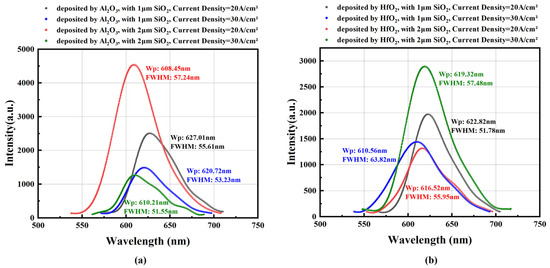 Wp and FWHM of pixels with different conditions under the injected current of 200 mA and 300 mA. (a) Wp and FWHM of pixels treated with Al2O3; (b) Wp and FWHM of pixels treated with HfO2.