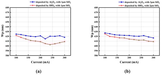 Wp under different driving currents with passivation treatment. (a) Wp under different driving currents with passivation treatment, with PECVD 1 μm SiO2; (b) Wp under different driving currents with passivation treatment, with PECVD 2 μm SiO2.