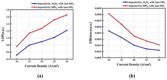 Figure 9a,b compare the light-output power (LOP) and electroluminescence efficiency of the 1-μm SiO2 groups. In the figure, the blue and red curves represent the Al2O3- and HfO2-passivated groups, respectively. The LOP increased monotonically with current density, with the HfO2 group exhibiting higher LOP values than the Al2O3 group. Combined with the result in Figure 6b, the leakage current density of the Al2O3 group without high-temperature baking is slightly higher under reverse negative voltage, which may affect the light-output efficiency of the device. Electroluminescence efficiency, calculated as LOP/(I × V), showed significant droop at higher current densities—a universal phenomenon in InGaN-based LEDs attributed to increased non-radiative recombination rates. At higher current densities, the injected carrier density increases, leading to an enhanced rate of non-radiative recombination. This results in more electrons and holes recombining non-radiatively rather than emitting energy as photons, thereby causing a decrease in LED efficiency, with the optoelectronic conversion efficiency decreasing as current density increases [37]. Notably, both LOP enhancement and efficiency droop trends were similar across passivation materials, suggesting that the efficiency degradation originates from inherent epitaxial defects, for example, material imperfections or structural limitations, rather than process-induced surface states or hydrogen-related deactivation.