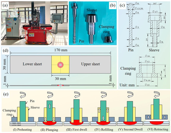 Schematic diagram of welding equipment, tools and copper sheet lap: (a) Welding machine; (b,c) RFSSW tools; (d) Lap dimensions; (e) Welding principle.