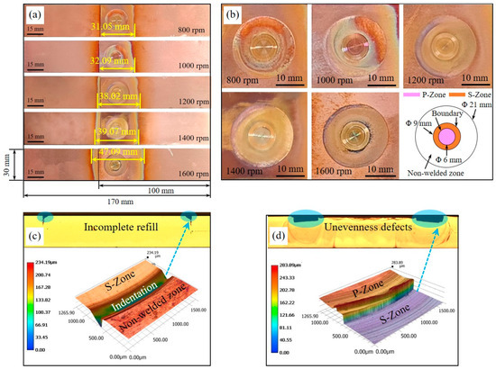 Appearance and typical defects of welded joints at different rotational speeds: (a) Welded specimens at different rotational speeds; (b) Enlarged views of welded joints; (c) Incomplete refill defect at 800 rpm; (d) Surface unevenness defect at 1400 rpm.