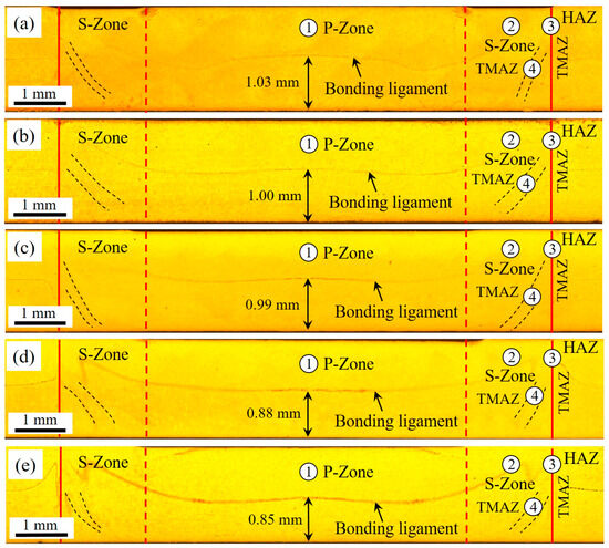 Cross-sectional macrostructure of the welded joints at different rotational speeds: (a) 800 rpm; (b) 1000 rpm; (c) 1200 rpm; (d) 1400 rpm; (e) 1600 rpm.