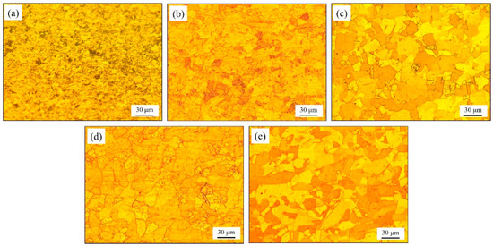 Microstructure at zone ① under different rotational speeds: (a) 800 rpm; (b) 1000 rpm; (c) 1200 rpm; (d) 1400 rpm; (e) 1600 rpm.