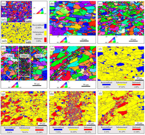 EBSD maps and DRX maps of the base material and different zones of ①, ②, ③ and ④: (a1) IPF map of the base material; (a2) DRX map of the base material; (b) IPF map of the Zone ①; (c) IPF map of the Zone ②; (d) IPF map of the Zone ③; (e) IPF map of the Zone ④; (f) DRX map of the Zone ①; (g) DRX map of the Zone ②; (h) DRX map of the Zone ③; (i) DRX map of the Zone ④.