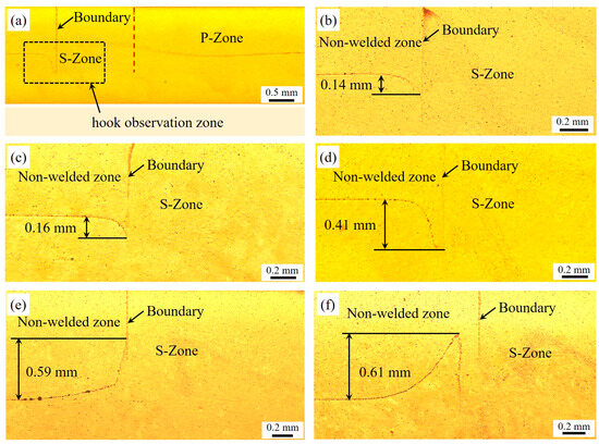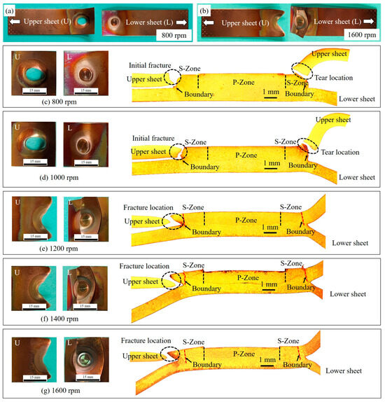 To elucidate the fracture locations of welded joints under different rotational speeds, the morphologies of the cross-sections of fractured joints were observed, as shown in Figure 11. Two types of fractures were identified: plug fracture (Figure 11a) and upper sheet fracture (Figure 11b). In plug fracture, the upper sheet completely fractures along the boundary of the welded joint, leaving the stir zone in the lower sheet. In upper sheet fracture, part of the material at the tensile end of the upper sheet detaches, while the stir zone and free end material of the upper sheet remain embedded in the stir zone of the lower sheet. At rotational speeds of 800 rpm and 1000 rpm, the fracture type is a plug fracture, with the fracture location near the boundary of the welded joint. In this case, the bonding between the upper and lower sheets in the stir zone is relatively tight, and no fracture surfaces were observed. When the rotational speed ranges from 1200 rpm to 1600 rpm, the fracture type transitions to upper sheet fracture, with the fracture location situated at a certain distance outside the boundary of the welded joint in the upper sheet. Moreover, the distance of the fracture location from the boundary increases with rotational speed. It should be noted that in Figure 11f, the weak material flow at the center of the P-Zone results in poor bonding. However, since the material at the boundaries of the welded joint exhibits strong bonding strength, the fracture does not occur within the interior of the welded joint.