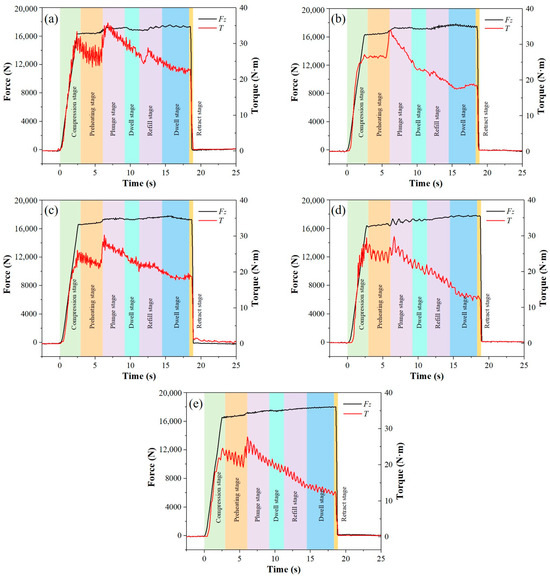 Variations in axial force and torque at different rotational speeds: (a) 800 rpm; (b) 1000 rpm; (c) 1200 rpm; (d) 1400 rpm; (e) 1600 rpm.