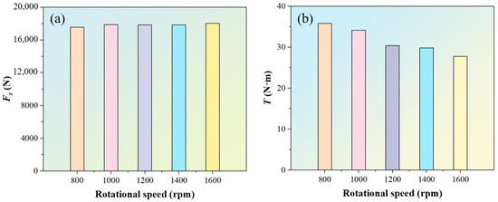Peak axial forces and torques at different rotational speeds: (a) Axial force; (b) Torque.