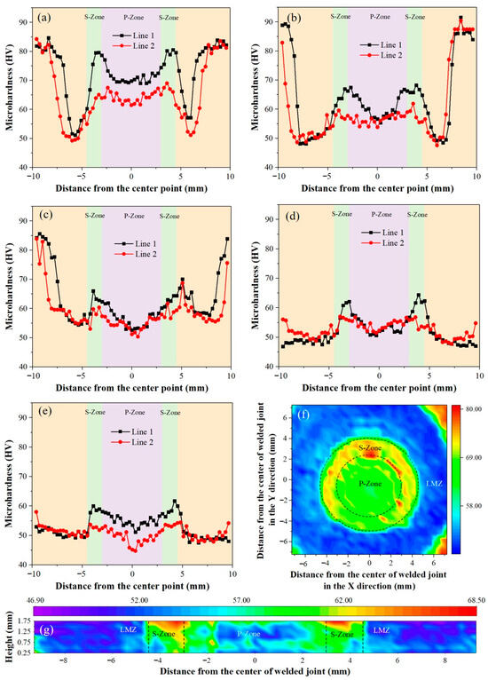Figure 9f,g show that at 1400 rpm, the highest microhardness in the cross-section is located at the top of the S-Zone in the upper sheet. Within the S-Zone, as the distance from the top of the upper sheet increases, the microhardness gradually decreases. This is because the material at the bottom of the S-Zone experiences shorter mechanical stirring durations, and under higher heat input, the grains become coarser. In the P-Zone, the microhardness is higher near the top zone of the upper sheet but lower at the center. This is because the material near the top of the upper sheet is subjected to continuous mechanical stirring before welding completion, resulting in finer grains compared to the interior material. Overall, the S-Zone exhibits higher microhardness than the P-Zone. Additionally, a noticeable low microhardness zone (LMZ) is formed on both sides of the welded joint, where microhardness values are significantly lower than those in the S-Zone and P-Zone. This indicates that the outer zones of the welded joint experienced greater heat input. In this study, the surface microhardness and cross-sectional microhardness cloud maps were conducted only for a typical welded joint; a similar trend is expected for welded joints produced at other rotational speeds.