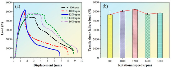 Displacement-load curves and tensile-shear failure loads of the welded joints at different rotational speeds: (a) Displacement-load curves; (b) Tensile-shear failure loads.
