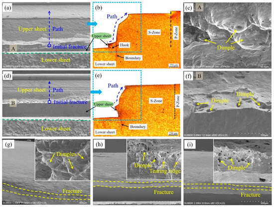 Fracture morphologies of welded joints at different rotation speeds: (a–c) Fracture morphologies at 800 rpm; (a) SEM image of fracture; (b) Cross-sectional image at fracture; (c) Initial fracture morphology at position A; (d–f) Fracture morphologies at 1000 rpm; (d) SEM image of fracture; (e) Cross-sectional image at fracture; (f) Initial fracture morphology at position B; (g) Fracture morphology at 1200 rpm; (h) Fracture morphology at 1400 rpm; (i) Fracture morphology at 1600 rpm.