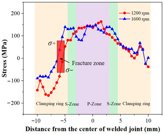 As shown in Figure 11, when the rotational speed ranges from 1200 rpm to 1600 rpm, all fracture locations are situated at a certain distance outside the boundary of the welded joint in the upper sheet. The reason for this fracture location is closely related to the microstructural characteristics of the material in this zone and the residual stress distribution. First, this zone lies in the HAZ of the welded joint, unaffected by direct stirring from the tool. The significant heat input results in coarse microstructure, reducing microhardness, as shown in Figure 9f,g. Additionally, the fracture zone in the welded joint coincides with the vicinity of the interface between residual tensile stress and residual compressive stress, as shown in Figure 13. In this transitional zone, the stress gradient within the material is substantial. The abrupt change in stress direction facilitates localized stress concentrations or discontinuities in the stress field, making this zone more susceptible to crack formation and damage. Although the boundary of the welded joint experiences significant residual tensile stress, the material at the boundary undergoes intense mechanical stirring by the tool, forming a fine-grain zone (Figure 5d) and resulting in enhanced bonding strength. Thus, no fractures occur at the boundary. Figure 12g–i show that in upper sheet fractures, the initial fracture surfaces contain numerous dimples of varying sizes, along with some tearing ridges. Evidence of significant plastic deformation near the fracture surface confirms that severe plastic deformation occurred before fracture. Therefore, the initial fracture mode in upper sheet fractures is also determined to be ductile.
