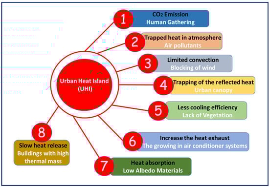 The UN’s intergovernmental panel on climate change recommended that exceeding the 1.5 °C threshold causes huge risks for climate change such as recurrent and severe droughts, heat waves, and rainfall. Consequently, one of the Paris Agreement goals is to reduce global warming to 1.5 °C. This desired goal was planned to be achieved by reaching the peak of greenhouse gas (GHG) emissions by 2025 and dropping to 43% by 2030. Although, of that, the world is going in a deviated path away from such a target due to the substantial increase in the emission of the GHG [1]. The urban heat island (UHI) phenomenon is considered one of the main factors that increases global warming. UHI is the phenomena of a variance in the temperature inside urban regions and their surrounding rural areas. Figure 1 outlines a variety of factors that led to this uncommon circumstance. This schematic picture depicts the primary causes of the UHI phenomenon. The emission of CO2 reached its high level in the city centers due to the enormous human gathering. As a result of storing heat by CO2, the atmospheric temperature is increasing, which contributes to the growing UHI phenomenon [2]. The trapped heat due to air pollution is one of the most significant drawbacks of urban development. In this respect, the exhaust gases from vehicles and industrial pollutants are facilitating the trapping of solar radiation that is leading to the increase in the microclimate effect [2,3]. Furthermore, the urban canopy created by stacked buildings contributes to the trapping of heat. The reflected heat from a building is stuck as a result of multi-layer taller buildings [4]. Also, the heat is trapped due to wind blocking by densely built buildings, which makes air movement limited, and the cooling effect by convection is reduced [5]. One of the primary causes of UHI is the lack of vegetation due to the excessive replacement of natural vegetation with buildings and paved surfaces [6]. One cannot rule out the adverse impact on the growth of the UHI phenomenon due to the excessive usage of air conditioners as well. The atmospheric temperature increases as a result of the exhaust heat from air conditioning (AC) systems. The features of the materials used in the construction of buildings and roads have a significant effect on the atmospheric temperature. The building with a lot of thermal mass, low albedo materials, and/or dark surfaces has an increase in the amount of stored heat and a slow rate of heat dissipation overnight. The substitution of such materials with other functional ones could play an important role in reducing the UHI phenomenon as well as creating easy solutions for cooling other than conventional air conditioning systems. In this respect, a lot of research works are concerned with developing such materials as eco-friendly cooling tools [7].