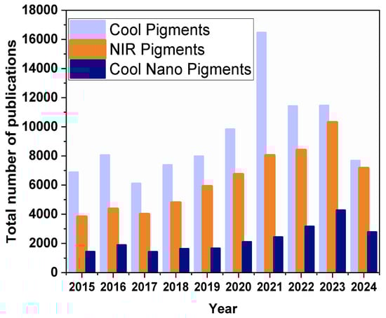 PGs are classified as either inorganic or organic substances that are insoluble, meaning they are dispersed in the medium, typically referred to as the binder, in which they are incorporated. The creation of paint or coating involves the dispersion of these PGs in binders, with the addition of solvents and certain additives. The resultant properties of the paint are closely linked to the characteristics of the PGs, binders, and other additives utilized in the formulation [45]. The branch of PGs has attracted a significant amount of interest from researchers and industry professionals as well. As illustrated in Figure 3, column charts show the total number of publications per year for the last decade that contain the keywords “Cool Pigments”, “NIR Pigments”, and “Cool Nano Pigments”. The results reveal the importance of this area of study. Noticeably, the total number of publications that are related to the keyword “Cool Pigments” is exceptionally high. This can be attributed to the broad and versatile nature of the keywords, which encompass a wide range of applications and research topics. In contrast, the number of publications that specifically address “Cool Nano Pigments” is the focus of nano PGs, particularly those that are utilized in the particular cool area of research.
