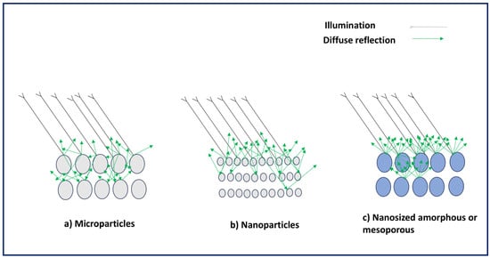 The series of inorganic white PGs with infrared reflectivity comprises PGs such as TiO2, Al2O3, and ZnO [2]. Table 1 illustrates the NIR reflectance of some white pigments prepared with various synthesization techniques. These PGs have garnered significant attention due to their notable reflectivity in VIS and NIR spectra. However, the high reflectance in the VIS range results in a bright and visually displeasing white color to the human eye. In addition, it should be noted that the aforementioned white surfaces tend to accumulate dirt due to the presence of air pollution or stains caused by rain. Consequently, a considerable number of individuals tend to opt for the use of white PGs in non-exposed locations [4]. In addition, it should be noted that the NIR reflectance of white cool PGs diminishes over time. Furthermore, mutually facing structures, which form an urban canyon, may cause radiation to bounce back and forth without reemerging. The utilization of color elements in doping offers a promising strategy for addressing the limitations associated with white cool PGs. The introduction of color elements such as chromium (Cr), nickel (Ni), cobalt (Co), and others into a material leads to a decrease in NIR reflectivity. This decrease can be attributed to an increase in absorbance, which arises from the creation of trap levels associated with the doped elements [13,60,61]. In order to improve the reflectance of cool-colored materials, the utilization of nanostructured PGs, NPGs, is employed. The synthesis technique enables the generation of a greater quantity of reflectance points, hence enhancing the scattering of light [62]. Figure 4 depicts the relationship between particle size reduction and the augmentation of light’s diffuse reflectance by providing a greater number of sites. The roughness of a material’s surface is a crucial factor that considerably influences the intensity of diffuse reflection. The greater surface area possessed by nanoparticles, as opposed to microparticles, may potentially result in increased reflectivity for various materials. The high degree of reflectance observed allows for the mitigation of the elevated light absorbance caused by trap levels associated with the doped color element in color NPGs. Recently, nanosized amorphous TiO2 has demonstrated potential for high NIR reflectance, which can be attributed to its substantial surface area resulting from its prominent surface characteristics [61,62]. Figure 4 demonstrates that the roughness of a surface enhances the reflectance, even with small particles like amorphous and mesoporous particles (Figure 4c), as compared to crystalline nano- and micro-sized particles (Figure 4a,b). According to Mansour et al. [28], nanosized amorphous TiO2 doped with Cr showed effective performance as cool-colored NPS. This approach increases the likelihood of utilizing amorphous and mesoporous particles in applications involving cold painting. Using such materials offers an additional advantage, such as the low temperature required for synthesis and their low density, which will improve their dispersion in epoxy paint. However, the thermal stability of amorphous materials is relatively lower than that of crystalline materials, which might have an impact on their reflectance properties and color indices.