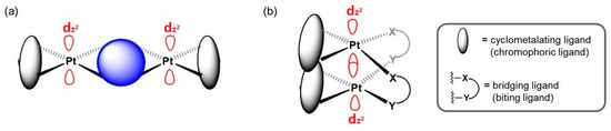Simplified structural representation of different dinuclear Pt(II) complexes depending on the (a) absence or (b) presence of intramolecular Pt-Pt interactions.