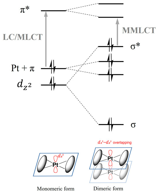 Unlike the excimer forms caused by molecular aggregation in concentrated liquid or solid states, designing structures to enforce the overlap of dz2 orbitals is beneficial (Figure 2b). This approach not only ensures the reproducibility of dinuclear molecular structures but also allows the systematic analysis of the optical properties of red- or NIR-emissive dinuclear Pt(II) complexes. The overlap of dz2 orbitals between two Pt(II) metal centers leads to the formation of new dσ and dσ* orbitals (Figure 3). As the two Pt metals come closer, the energy state of the dσ* orbital, which becomes the highest occupied molecular orbital (HOMO), increases, reducing the optical bandgap. Consequently, this induces a narrow optical bandgap suitable for red and NIR emissions. Typically, the π* orbital of the chromophoric cyclometalating ligand is positioned between the dσ* orbital and the vacant 6pσ orbital [26,27], and the emission process follows an MMLCT mechanism.