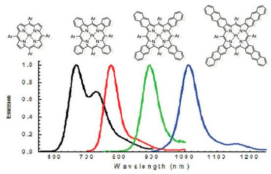 Molecular structures and photoluminescence spectra of NIR-phosphorescent π-extended platinum porphyrins in toluene. Adapted with permission from [79]; Copyright 2011 American Chemical Society.