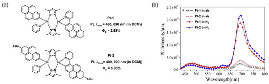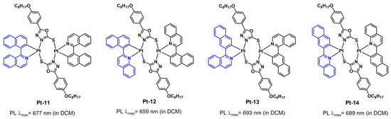(a) Structures of deep-red emissive dinuclear Pt(II) complexes and (b) PL spectra in diluted DCM solutions (1 × 10−5 M) containing long π-conjugated cyclometalating ligands. Image reproduced with permission from [80]; Copyright 2016 Elsevier.
