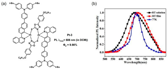 (a) Molecular structure and (b) photoluminescence spectra of red-phosphorescent π-extended Pt(II) complex, Pt-3. Image reproduced with permission from [81]; Copyright 2016 Elsevier.