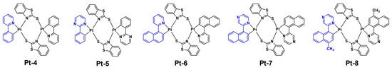 Mercaptobenzothiazole-bridged dinuclear Pt(II) complexes, Pt-4−Pt-8. Redrawn from [82].