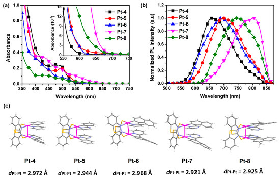 (a) UV-vis absorption and (b) PL spectra in CH2Cl2 solutions and (c) single-crystal structures of dinuclear Pt(II) complexes, Pt-4−Pt-8. Image reproduced with permission from [82]; Copyright 2022 American Chemical Society.