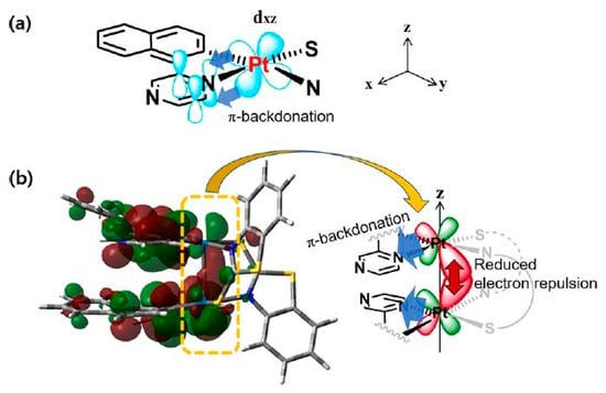 Proposed orbital overlap in Pt-7. (a) Interaction of the filled dxz orbital (Pt) with the empty antibonding π*-orbitals (pyrazine) enabling π-backdonation. (b) Partial orbital overlap between the two dxz orbitals of Pt metals in the DFT calculation. Adapted with permission from [82]; Copyright 2022 American Chemical Society.