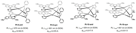 Cyclometalating ligands can adopt either symmetric or asymmetric structures. In the case of asymmetric structures, the double-decker-type dinuclear Pt(II) complex can exist as syn- or anti-form isomers. The syn(cis)- and anti(trans)-configurations are determined by the coordination geometry of the two cyclometalating ligands, which are arranged in parallel within a double-decker configuration of the molecule. It has been reported that these isomeric forms are primarily induced by variations in the coordination pattern of the bridging ligand rather than by direct modifications to the cyclometalating ligand [45,83,84]. In their 2024 study, Yao et al. reported the synthesis of syn- and anti-isomers of dinuclear Pt(II) complexes through the incorporation of various bridging ligands, followed by their isolation and a comprehensive analysis of their crystal structures and photophysical properties [27] (Figure 10). In this study, the syn-isomer exhibited a smaller energy gap than the anti-isomer, resulting in a red-shifted emission wavelength despite having a longer intramolecular Pt-Pt distance. The Pt-9-syn and Pt-10-syn compounds exhibit longer emission wavelengths of 801 nm and 657 nm, respectively, compared to their anti-counterparts, which emit at 670 nm (Pt-9-anti) and 629 nm (Pt-10-anti). According to the results of their DFT calculations, Pt-9-anti (and Pt-10-anti) exhibit a HOMO distribution similar to that of Pt-9-syn (and Pt-10-syn), mainly localized on the antibonding Pt-Pt dσ* orbitals and slightly on the carbazole moiety of the ligand. However, the LUMO distribution of Pt-9-anti (and Pt-10-anti) is primarily localized on one pyrimidine moiety of the two ligands, while in Pt-9-syn (and Pt-10-syn), it is localized on both pyrimidine moieties. The resulting change in the LUMO energy level appears to have a more significant impact on the energy gap than changes in the distance between the Pt metals.