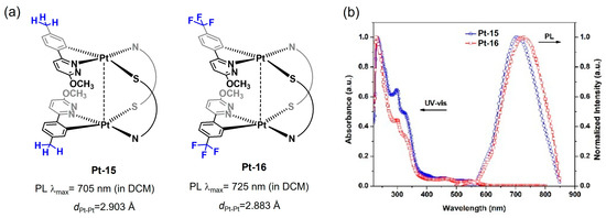 Effect of substituents on the cyclometalating ligands to shorten the Pt-Pt distances. (a) Molecular structures and (b) Uv-vis absorption and PL spectra of Pt-15 and Pt-16. Image reproduced with permission from [10]; Copyright 2024 Elsevier.