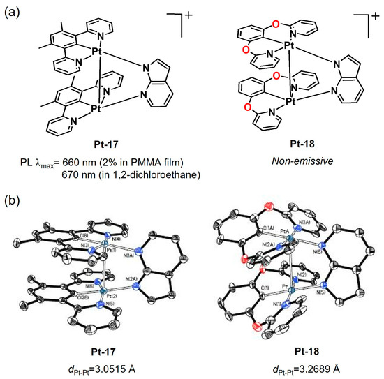 Additionally, an increase in the flexibility of the cyclometalating ligand resulted in a non-planar, wavy molecular structure, leading to an increased Pt-Pt distance. According to a 2024 study by Esteruelas et al. on Pt-18, which featured an aromatic ring in the ligand connected via an oxygen atom, it exhibited a more pronounced wavy structure compared to its counterpart, Pt-17, which lacks this feature [87] (Figure 13). This structural distortion resulted in an extended Pt-Pt distance from 3.0515 Å in Pt-17 to 3.2689 Å in Pt-18. Pt-17 exhibited a maximum emission at 670 nm in solution and at 660 nm in film, whereas Pt-18 showed practically no emission (Figure 13). Furthermore, the use of a tridentate (N^C^N) ligand instead of a bidentate (C^N) ligand allowed for the incorporation of only a single bridging ligand within the dinuclear Pt(II) complex. Compared to structures containing two bridging ligands, this configuration increased the molecular flexibility, thereby providing greater potential for an extended Pt-Pt distance. Furthermore, molecules with structural flexibility are more susceptible to increased interactions between halogen(X)-containing solvent molecules and the aromatic moieties of the ligand, known as π-X interactions, in dilute solutions. These interactions readily lead to an expanded Pt-Pt distance, thereby disrupting metal–metal-to-ligand charge transfer (MMLCT). Consequently, as the concentration of Pt-17 decreases in 1,2-dichloroethane, the MMLCT characteristic weakens, and the relative emission intensity at shorter wavelengths around 480 nm increases (Figure 14b).