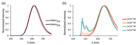 (a) PL spectra of Pt-17 in (a) film state (2% in PMMA) and (b) solution state (in 1,2-dichloroethane) at room temperature. Adapted with permission from [87]; Copyright 2024 American Chemical Society.