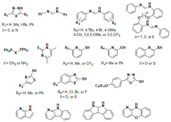 Bright red emission has been achieved using four-bond bridging ligands such as mercapto- [86,90,91,92] or hydroxy- [53,93] substituted N-heterocycles (N-C-S or N-C-O). More recently, rigid and fused N-heterocycles, including N-protonated α-carboline [88], 7-azaindole, and indolo[2,3-b]indole [87] (N-C-N), have also been explored as bridging ligands (Figure 16).