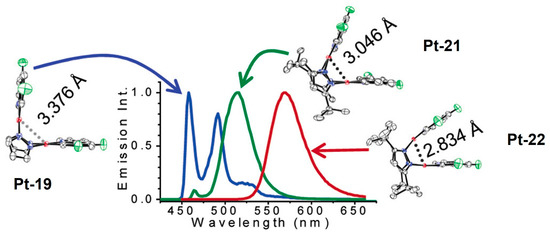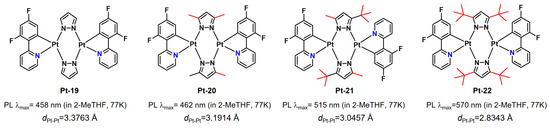 Control of Pt-Pt separation by modulating the μ-pyrazolate bridging ligand and the resulting PL spectra of Pt-19, Pt-21, and Pt-22. Image reproduced with permission from [52]; Copyright 2005 American Chemical Society.