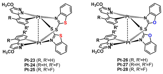 According to a 2023 study by Rajakannu et al., the Pt-Pt distance can be modulated by adjusting the electron density of the bridging ligand [94]. Specifically, replacing oxygen (-O) in the bridging ligand with less electronegative sulfur (-S) destabilizes the metal-centered HOMO energy level, thereby narrowing the HOMO-LUMO energy gap. Consequently, this reduction in the energy gap facilitates emissions at longer wavelengths. The authors synthesized and systematically analyzed the optical properties of six compounds (Pt-23–Pt-28) incorporating two types of bridging ligands: benzothiazole-2-thiol and benzoxazole-2-thiol (Figure 19). The compounds featuring benzothiazole-2-thiol (Pt-23–Pt-25) exhibited red-shifted emission wavelengths compared to those incorporating benzoxazole-2-thiol (Pt-26–Pt-28) (Figure 20). The Pt-Pt distances were rigorously examined through theoretical studies, revealing that when the bridging ligand was substituted from benzothiazole to benzoxazole (as observed in the comparison between Pt-25 and Pt-28), the Pt-N bond distance shortened, leading to increased electron repulsion and a subsequent elongation of the Pt-Pt distance from 3.106 Å to 3.175 Å. As a result, Pt-25 (λmax = 722 nm) exhibited a narrower energy bandgap and a 26 nm red-shifted emission compared to Pt-28 (λmax = 696 nm).