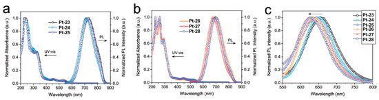 UV-vis absorption and PL spectra of (a) Pt-23~Pt-25 and (b) Pt-26~Pt-28, and (c) comparison of the PL spectra of Pt-23−Pt-28. Image reproduced with permission from [94]; Copyright 2023 WILEY.