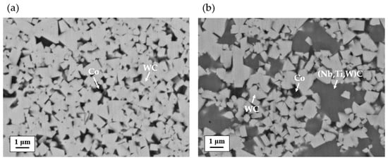 FESEM micrographs of the investigated hardmetal grades (a) plain WC-Co, and (b) WC-Co-γ systems. γ-phase and WC grains are depicted in dark and light grey respectively, while Co binder appears as black region interspersed among the carbides.