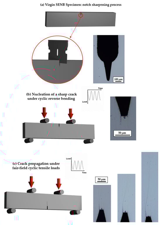Fracture toughness was assessed using SENB specimens with dimensions 45 × 10 × 5 mm, with a notch length-to-specimen width ratio (a/W) of 0.4, under four-point bending configuration tests. In doing so, an articulated test jig, with outer and inner spans of 40 and 20 mm, respectively, was employed. Notches were introduced using electrical discharge machining (EDM). Then, a tip sharpening step was performed with a razor blade impregnated with diamond paste to achieve a smaller tip curvature, between 10 and 20 μm (Figure 2a). Sharp crack nucleation at the notch tip was then induced by applying cyclic compressive loads under reverse bending, using the same testing configuration and jig as previously described (Figure 2b). This process employed a sinusoidal waveform at a testing frequency of 10 Hz and a load ratio (R = σmin/σmax) of 10, with maximum compressive stress ranging from 400 to 600 MPa. Cyclic reverse bending tests were run until cracks of approximately 10 μm in length were nucleated [,]. Samples were side-polished to discern crack nucleation phenomena.