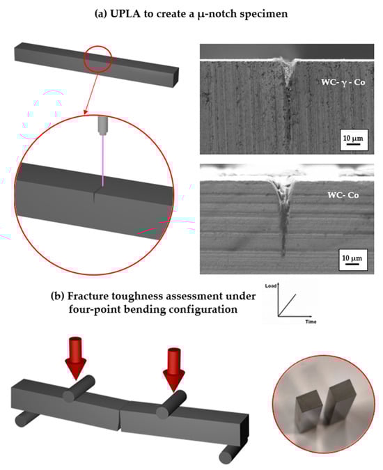 As a result, ultrashort pulsed laser ablation (UPLA) has emerged as a promising alternative for shaping shallow notches in testing specimens. This technique has been successfully applied in the surface texturing of hardmetal tools and components [,,]. The advantage of UPLA lies in its ultrafast laser–material interaction, which minimizes the heat transfer to the material substrate, thereby preserving its microstructural integrity while enabling precise and consistent shaping of micronotches (also referred to in this work as μ-notch) []. Several studies have demonstrated that μ-notches created using UPLA in prismatic bars yield fracture toughness values, when subjected to bending up to failure, comparable to those obtained with notched and pre-cracked specimens. This has been validated in materials such as yttria-stabilized zirconia, as well as on various plain WC-Co grades, positioning UPLA μ-notching as a reliable, efficient, and short time-consuming methodology for fracture toughness assessment [].