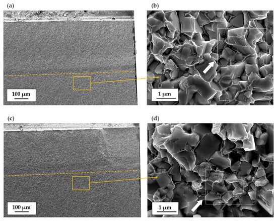 Relief of the residual stresses introduced during cyclic compression, required stable extension of the nucleated crack under tensile fatigue. As it is well-established in the literature, in cemented carbides such stable crack propagation predominantly occurs within the binder, following a crystallographic step-like path that generates sharp angular facets [,]. This behavior is commonly observed in SENB specimens containing an artificially long through-thickness crack []. In contrast, the failure micromechanism in the unstable crack propagation region is associated with the nucleation and coalescence of ductile microcavities—commonly referred to as dimples—located within the binder. This ductile ligament reinforcement represents the main toughening mechanism in hardmetals [,]. The unstable crack propagation region is further shown in Figure 4c,d, where higher magnification images emphasize the presence of ductile dimple microcavities. For the fracture toughness measurements, effective notch length was determined up to the point where dimple-like behavior was observed in high magnification FESEM images.