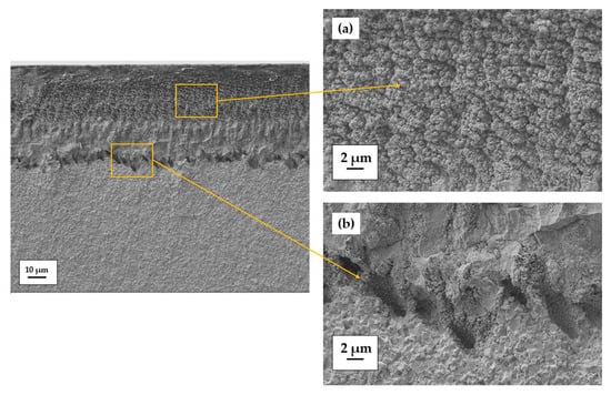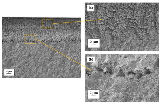 For the γ-phase containing cemented carbide, two distinct zones were evidenced on the fracture surface of the UPLA laser notch, both resulting from the direct or indirect interaction between the laser and the specimens. High magnification images of these zones are shown in Figure 5a,b for the γ-phase cemented carbide grade. Figure 5a depicts the geometrical notch generated by UPLA, where the observed pattern corresponds to material ablation. In Figure 5b, the pre-damaged zone ahead of the crack tip is highlighted, characterized by the small-scale interactions of interconnected microcracks induced during the process [,,]. This fractographic pattern is also identified in the reference WC-Co grade, as shown in Figure 6, underscoring the consistency between the reference cemented carbide and γ-phase containing grade.