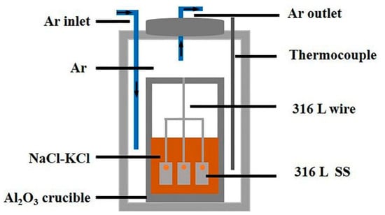 The static corrosion testing device is depicted in Figure 1. The prepared specimens of 316L SS were suspended across the holes in the crucible cover using a 316L SS wire. It was ensured that the 316L SS samples did not touch the bottom of the Al2O3 crucible. A total of 100 g of solid NaCl-KCl salt was ground, mixed, and transferred to an Al2O3 crucible to completely bury the 316L SS samples. A high-temperature glue was used to seal up the joint between the crucible and its cover, as well as the holes in the cover of the crucible, to ensure complete bonding. Three 316L SS specimens were placed in each Al2O3 crucible. A glove box with a highly pure Ar gas flow was used to conduct all the above operations, where the concentrations of O2 and H2O were below 10 ppm.