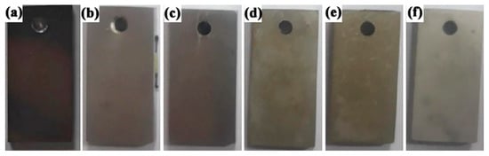 Photos of 316L SS specimens after static corrosion for different periods: (a) 0 h, (b) 25 h, (c) 50 h, (d) 100 h, (e) 200 h, (f) 400 h.