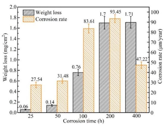 The weight changes and corrosion rates (CR) of the 316L stainless steel (SS) alloy after immersion in molten NaCl-KCl salt under an Ar flow at 700 °C for various durations are shown in Figure 3. The weight loss of the corroded 316L SS alloy increased with increasing immersion time. Specifically, the weight loss was 0.06 mg/cm2 at 25 h, which sharply increased to 1.70 mg/cm2 at 200 h. At 400 h, the weight loss reached 1.71 mg/cm2, which was nearly the same as that at 200 h.