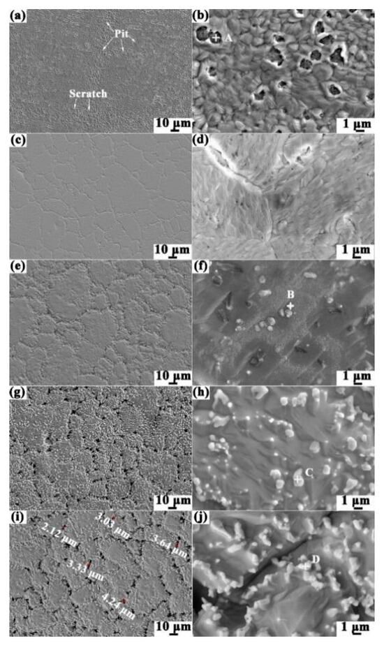 The acquired surface SEM images of the 316L SS specimens immersed in molten NaCl-KCl salts at 700 °C for varying time durations: (a,b) 25 h, (c,d) 50 h, (e,f) 100 h, (g,h) 200 h, and (i,j) 400 h.