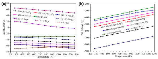 The areas marked A, B, C, and D in Figure 5 were found to be enriched in C and O, indicating that these regions might contain carbides and oxides. The plots of the change in Gibbs free energy (ΔG) of the corresponding carbides and oxides with temperature are presented in Figure 6. The value of ΔG was determined using the equation ΔGT = ΔHT + TΔST, utilizing the thermodynamic software of HSC Chemistry 6.0 (Metso Outotec, Espoo, Finland), where ΔGT denotes the value of ΔG at T K, and ΔST and ΔHT represent the differences in entropy and enthalpy of the reaction to the reactants at T K, respectively [39]. For a true comparison, the Ellingham−Richardson diagram was used, and it was computed from thermodynamic calculations, as shown in Figure 6 [40,41]. Combined with Table 3 and Figure 6, the region marked with A was a corrosive pit, and the corrosive products covered in the pit might have been Cr2O3. The bright particles marked B, C, and D in Figure 5 gathered Si and Mo, and the contents of C and O were also significantly higher compared to those in other regions. According to the calculated value of G, it could be concluded that the bright particles might be molybdenum/silicon oxides.