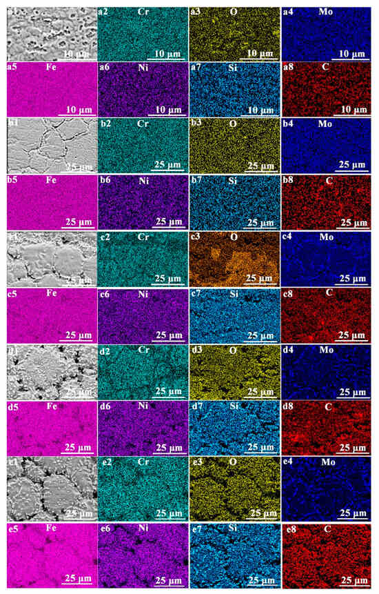 Elemental mapping images of 316L SS specimens immersed in molten NaCl-KCl salts at 700 °C for different time durations: (a1–a8) 25 h, (b1–b8) 50 h, (c1–c8) 100 h, (d1–d8) 200 h, (e1–e8) 400 h.